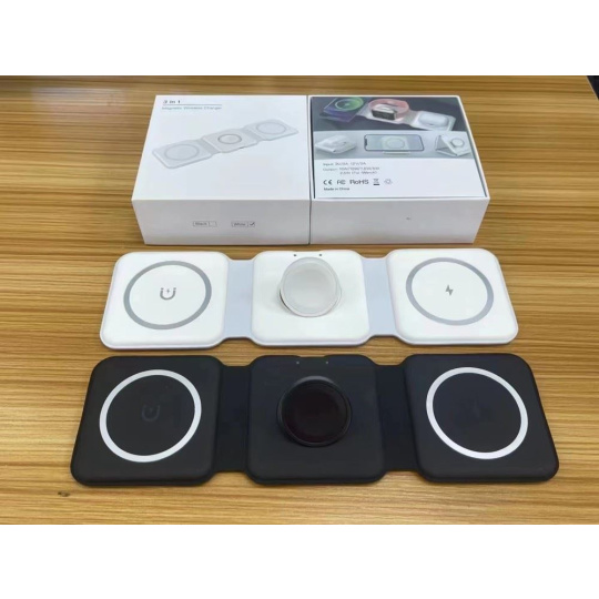 Kvalitní výkonná bezdrátová skládací 3 in 1 s podporou Apple MagSafe, iWatch, AirPods, ale i většiny telefonů, či příslušenství jiných značek podporujících bezdrátové QI nabíjení. Unikátní skládací řešení Vám umožňuje zvolit variantu použítí pouze jako podložku pro jedno zařízení, nebo stojánek případně nabíječku rozložit a nabíjet až tři zařízení. Nabíječku lze opět jednoduše složit do malé kompaktní podoby a v případě potřeby vložit do kapsy a jednoduše vzít kamkoli budete potřebovat.