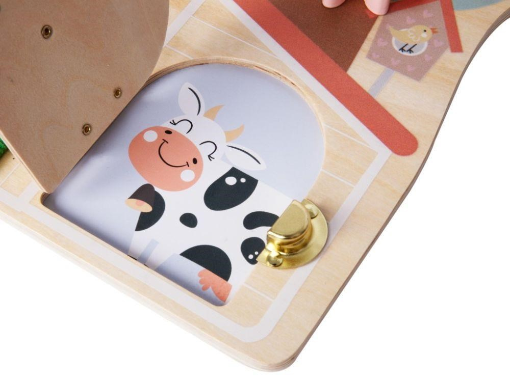 Activity board v podobě farmy zavede holčičky i chlapce na venkov, kde si pohrají s hracími prvky a osvojí si pár praktických dovedností. Activity board s ozubenými koly, korálkovým bludištěm, dvířky a okýnkem, různými zámky a různými způsoby zapínání vede děti k samostatnosti ve hře, v poznávání a učení se, v oblékání..
