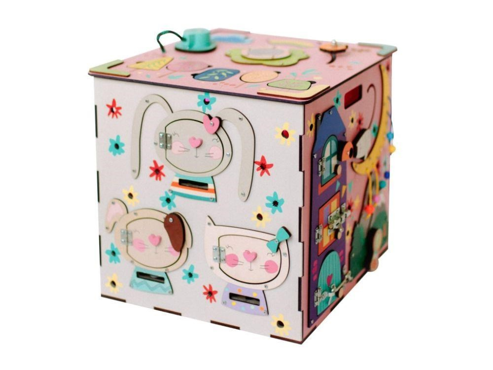 Activity board kostka s LED osvětlením XXL je originální montessori hračkou, která děti zabaví, zdokonalí jejich schopnosti a naučí je novým dovednostem. Každá strana růžového activity boardu je originální a nabízí nespočet možností ke hře, zkoumání a poznávání. Nechybí ozubená kola a kolečka, různé způsoby zapínání, tkanička, různé způsoby zavírání, korálky, bludiště, vkládací puzzle, různá překvapení i sluníčkový vypínač, který activity board kostku rozzáří..