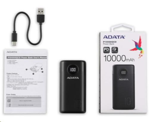 ADATA PowerBank AP10000 - externí baterie pro mobil/tablet 10000mAh, černá (37Wh) USB-C