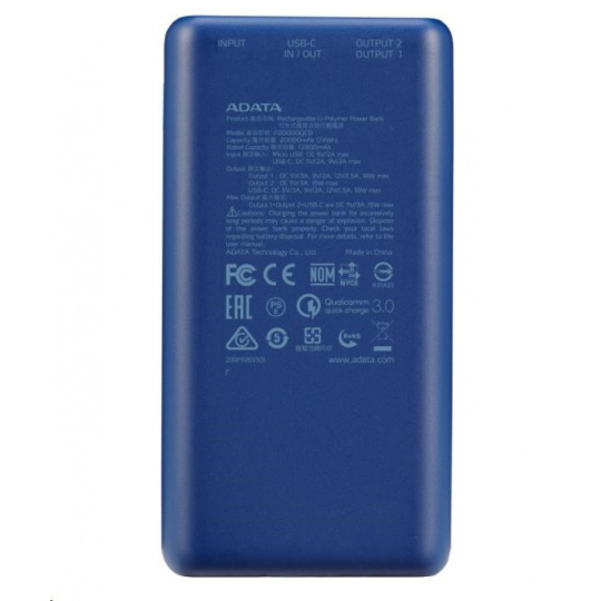 ADATA PowerBank P20000QCD - externí baterie pro mobil/tablet 20000mAh, 2,1A, modrá (74Wh)