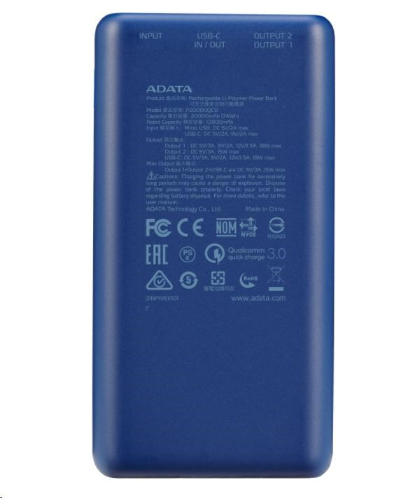 ADATA PowerBank P20000QCD - externí baterie pro mobil/tablet 20000mAh, 2,1A, modrá (74Wh)