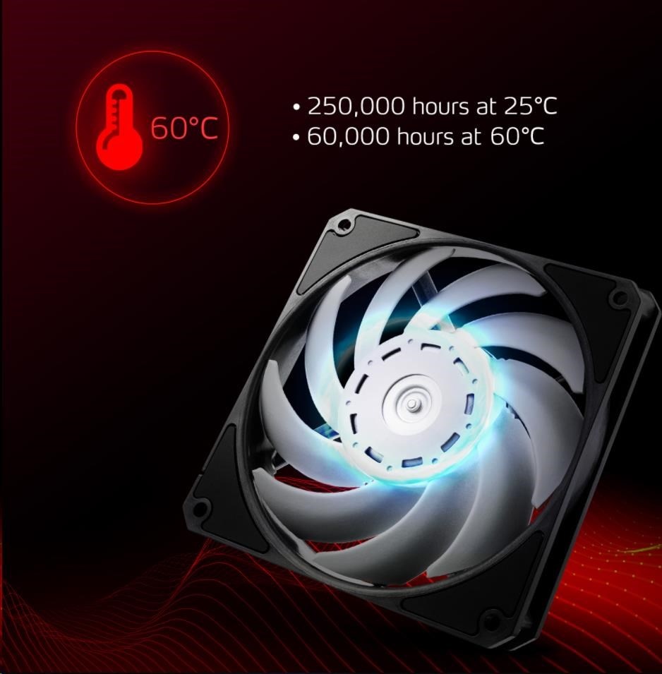 XPG VENTO PRO 120 PWM Fan has a verified MTTF (mean time to failure) 250,000 hours at 25?, or 60,000 hours at 60? ambient, which makes it ideal for heavier duty loads, e.g. more space-constrained builds with higher internal temperatures. Taking advantage of the high precision dual bearings, XPG VENTO PRO 120 PWM Fan can quietly operate and maintain stable at a large temperature range.