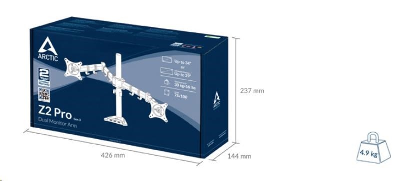 The ARCTIC Z2 Pro monitor arm supports the latest ultrawide monitors (up to 29 inches) with ease. Classic 16:9 monitors are also compatible (up to 34 inches). The Z2 Pro supports a total load of 15 kg/33 lbs.