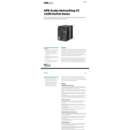 | Aruba 4100i 12-port 1GbE (8-port Class 4 POE and 4-port Class 6 POE) 2-port SFP+ DIN Mount Switch (JL817A) | ||