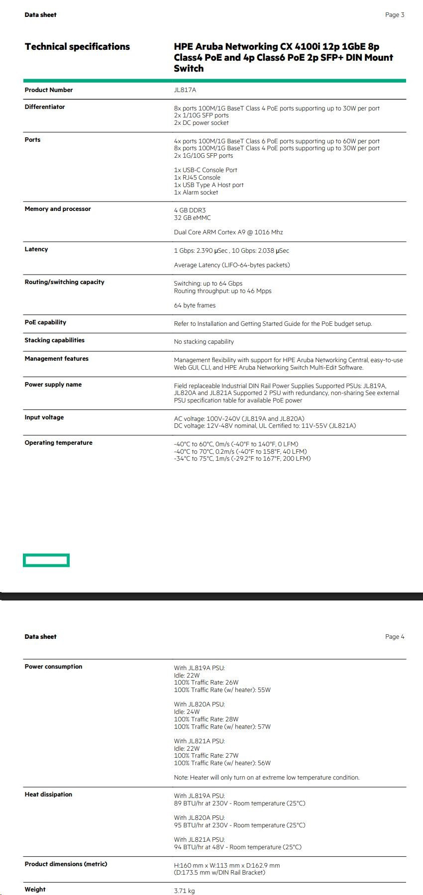 | Maximum heat dissipation BTU/hr | With JL819A PSU: 89 BTU/hr at 230V - Room temperature (25°C) With JL820A PSU: 95 BTU/hr at 230V - Room temperature (25°C) With JL821A PSU: 94 BTU/hr at 48V - Room temperature (25°C) | |