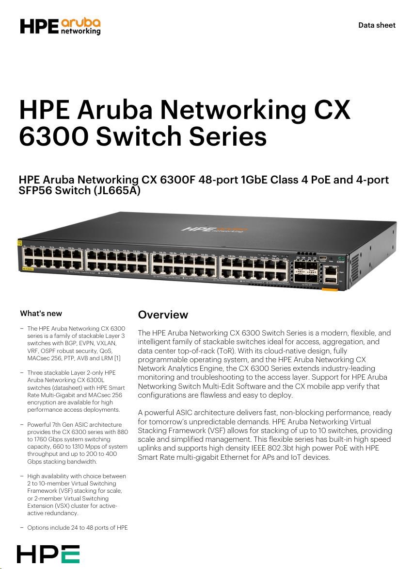 | Aruba 6300F 48-port 1GbE Class 4 PoE and 4-port SFP56 Switch (JL665A) | ||