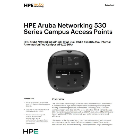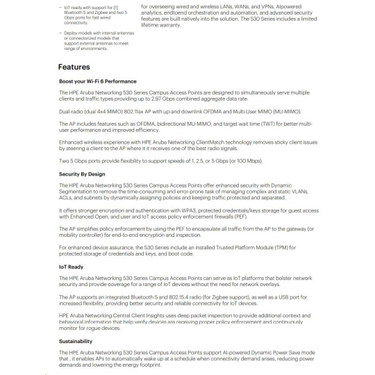 Aruba Wi-Fi 6 access points provide high-performance connectivity for any organization experiencing growing numbers of IoT and mobility requirements. With a maximum aggregate data rate of 3.55 Gbps (HE80/HE40), the Aruba 530 Series deliver the speed and reliability needed for any enterprise.