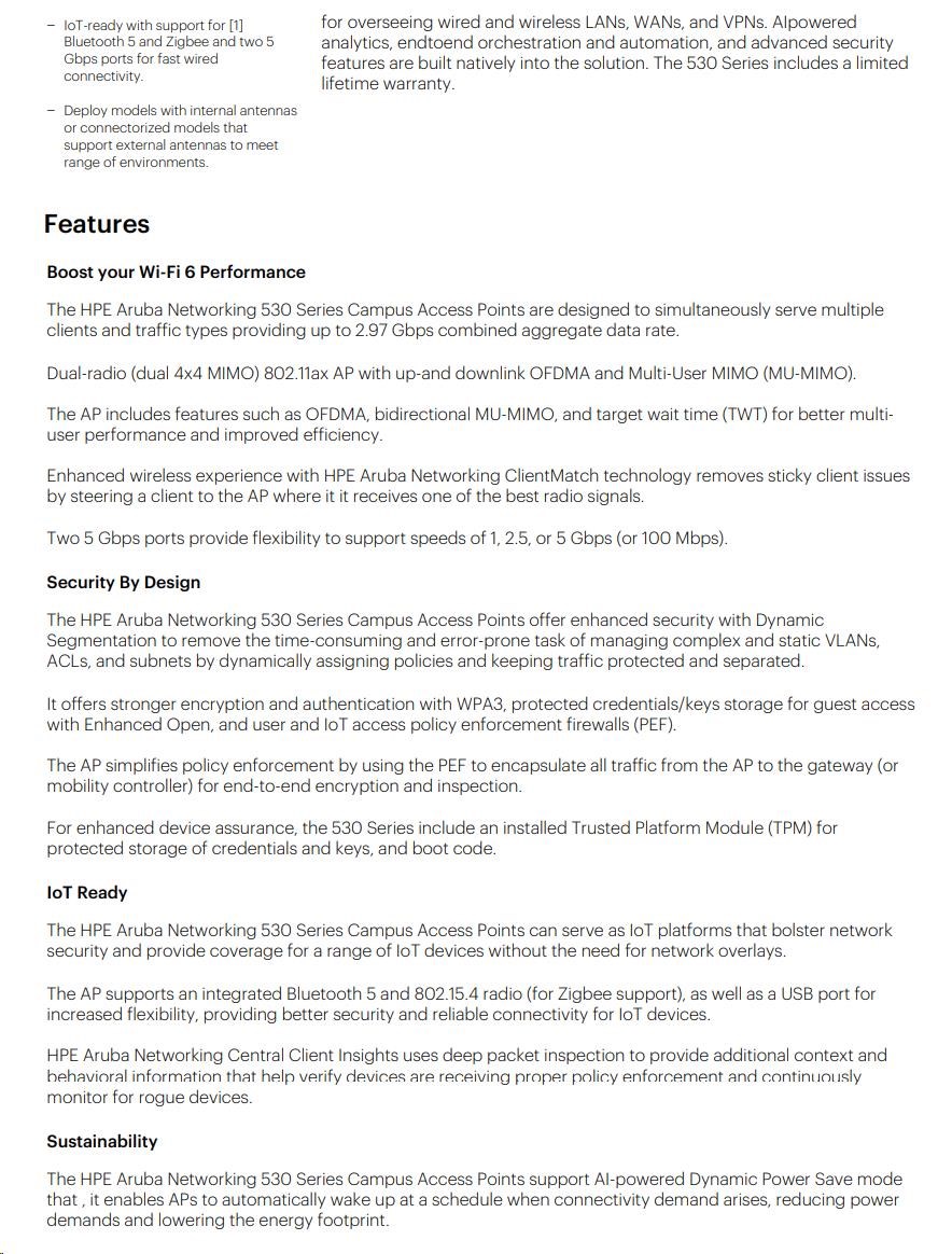 Aruba Wi-Fi 6 access points provide high-performance connectivity for any organization experiencing growing numbers of IoT and mobility requirements. With a maximum aggregate data rate of 3.55 Gbps (HE80/HE40), the Aruba 530 Series deliver the speed and reliability needed for any enterprise.