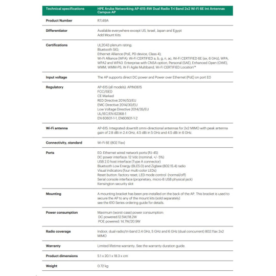 | Aruba AP-615 (RW) Dual-radio Tri-band 2x2:2 802.11ax Wi-Fi 6E Internal Antennas Campus AP | R7J49A |