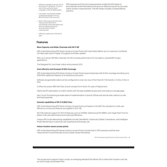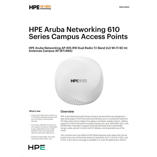 | Summary Aruba 610 Series Access Points are designed to take advantage of the 6 GHz band using two radios that can deliver comprehensive tri-band coverage in a multi-AP environment and better meet the growing demands of Wi-Fi due to increased use of video, growth in client and IoT devices, and expanded use of cloud. With a 3.6 Gbps combined peak data rate for higher throughput and faster speeds for indoor use, the Aruba 610 Series delivers a cost-effective enterprise Wi-Fi 6E solution with increased capacity, wider channels, reduced power consumption. |