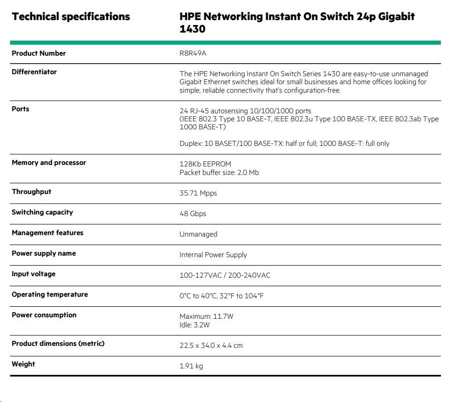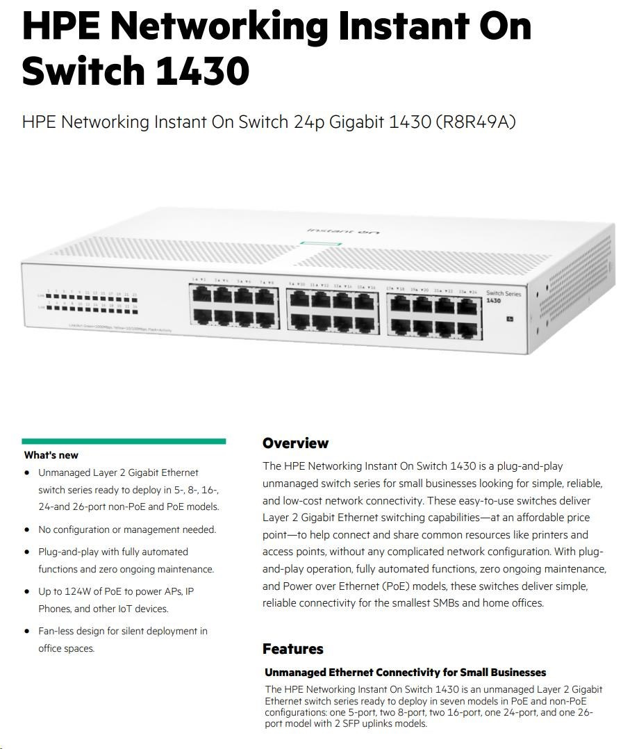 HPE Networking Instant On Switch 24p Gigabit 1430 R8R49A