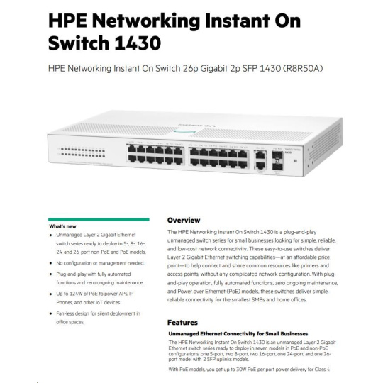 | Model | HPE Networking Instant On 1430 — 26p Gigabit + 2 SFP |