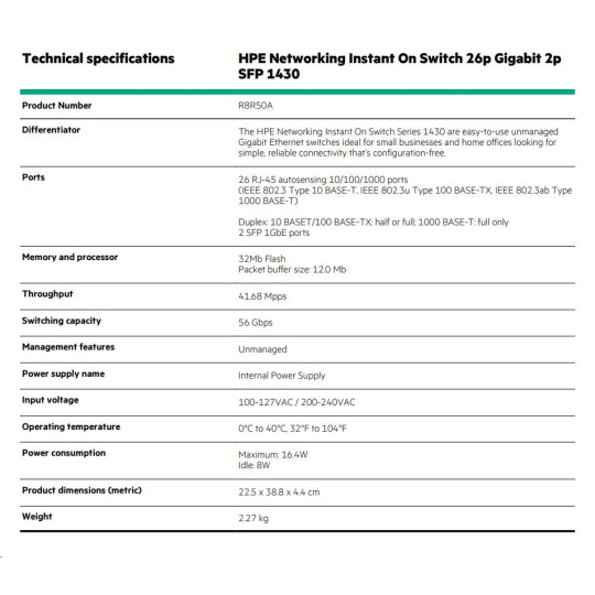 R8R50A HPE Networking Instant On Switch 26p Gigabit 2p SFP 1430