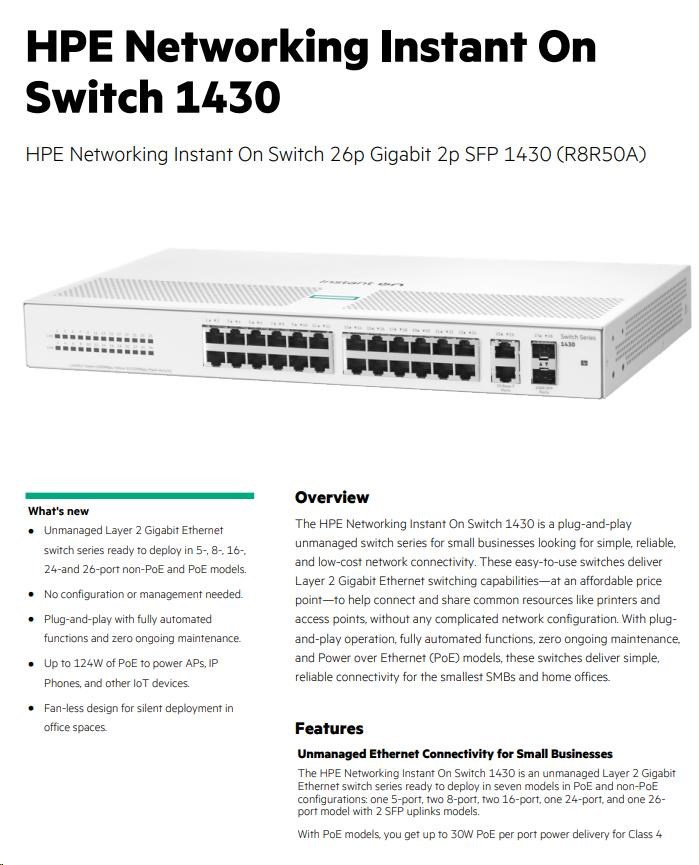 | Model | HPE Networking Instant On 1430 — 26p Gigabit + 2 SFP |