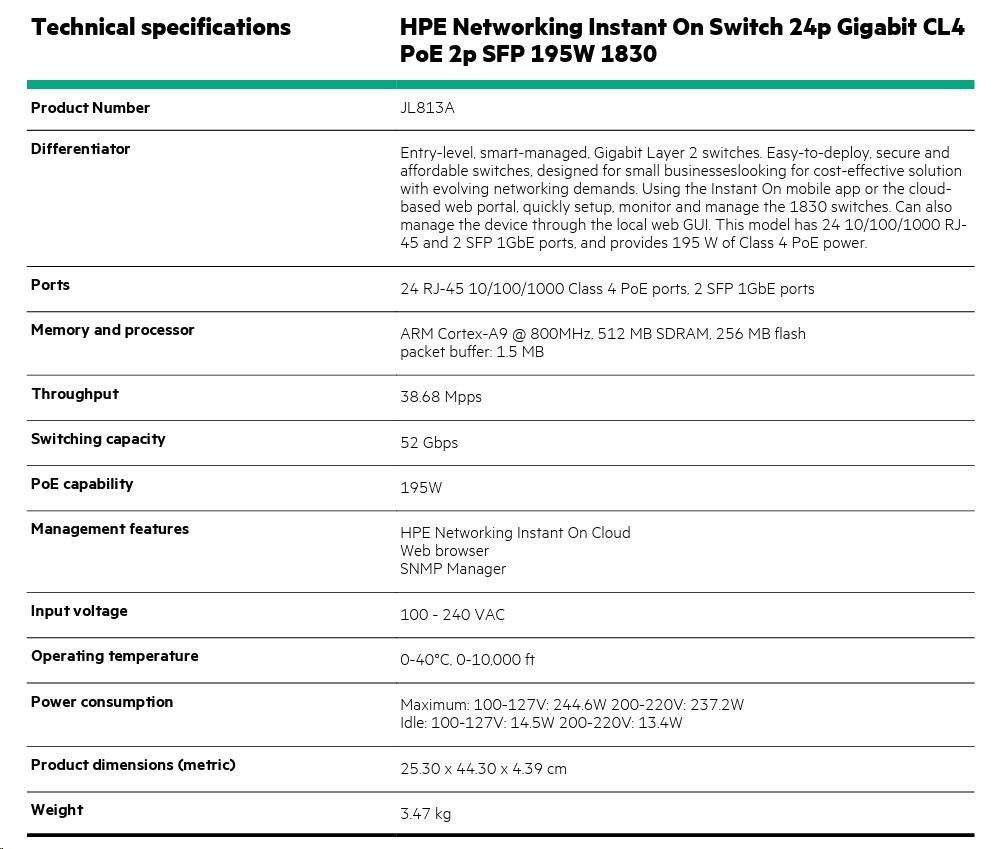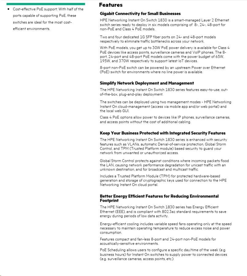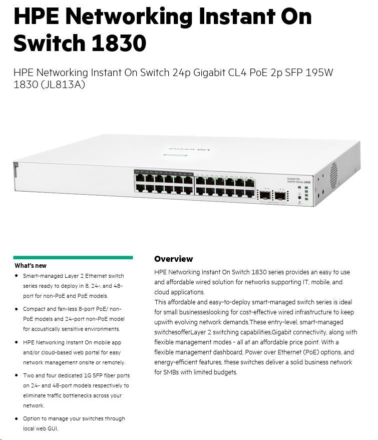 | Aruba Instant On 1830 8G Switch (JL810A) | Aruba Instant On 1830 8G 4p Class4 PoE 65W Switch (JL811A) | Aruba Instant On 1830 24G 2SFP Switch (JL812A) | Aruba Instant On 1830 24G 12p Class4 PoE 2SFP 195W Switch (JL813A) | Aruba Instant On 1830 48G 4SFP Switch (JL814A) | Aruba Instant On 1830 48G 24p Class4 PoE 4SFP 370W Switch (JL815A) | ||||
