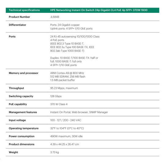 HPE Networking Instant On Switch 24p Gigabit CL4 PoE 4p SFP+ 370W 1930 (JL684B)