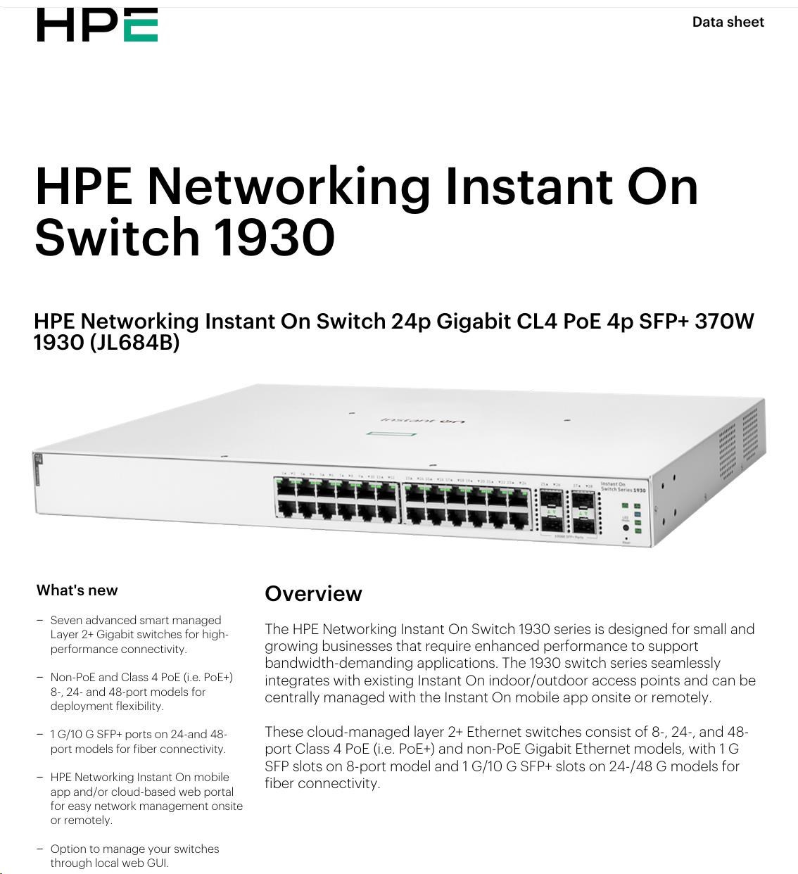 | Aruba Instant On 1930 24G Class4 PoE 4SFP/SFP+ 370W Switch (JL684B) | ||