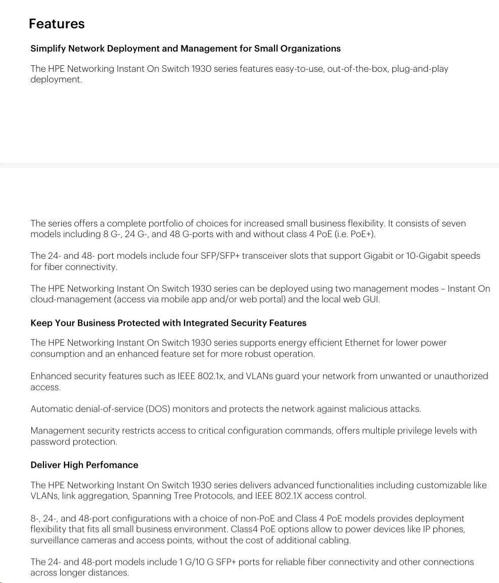 The Aruba Instant On 1930 switches features advanced, smart-managed, fixed- configuration Gigabit switches designed for small businesses that are easy-to-deploy and affordable. They're made to handle today's bandwidth-heavy applications like voice and video conferencing, enabling consistent connectivity to enhance performance.