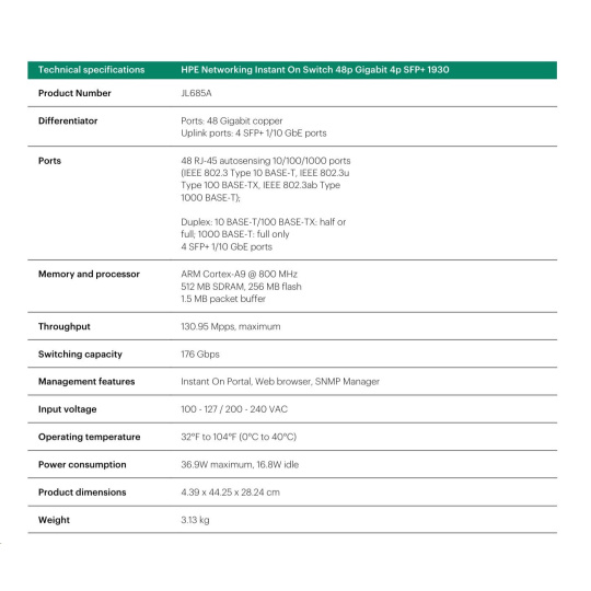 HPE Networking Instant On Switch 48p Gigabit 4p SFP+ Fanless 1930 JL685A
