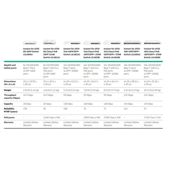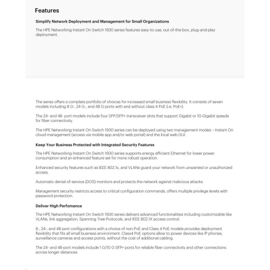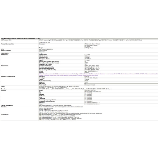 | Transceivers | Aruba Instant On 1G SFP LC SX 500m OM2 MMF Transceiver (R9D16A ) Aruba 1G SFP LC LX 10km SMF Transceiver (J4859D) Aruba Instant On 1G SFP RJ45 T 100m Cat5e Transceiver (R9D17A) Aruba Instant On 10G SFP+ LC SR 300m OM3 MMF Transceiver (R9D18A) Aruba 10G SFP+ LC LR 10km SMF Transceiver (J9151E) | |