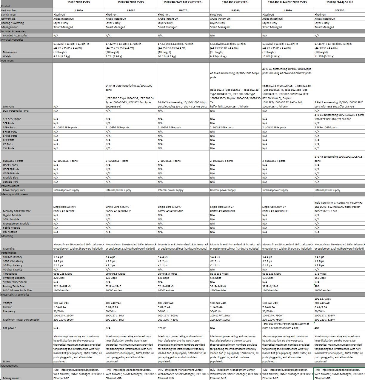 Notes1: 1 Acoustics measured in 23°C semi-anechoic chamber with a loading of 100% traffic and (for JL807A and JL809A) 50% PoE on all ports. Measured in accordance with ISO 7779. Declared in accordance with ECMA-109:2010. Values presented are the Declared A-Weighted Sound Power Level (LWAd) and the mean Bystander A-Weighted Sound Pressure Level (LpAm) | |