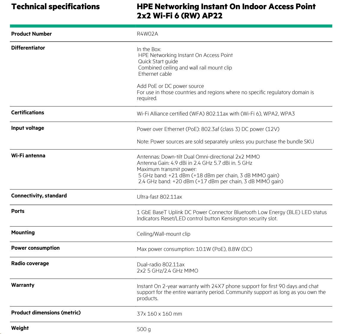 | Warranty & Support Aruba Instant On 2-Year warranty with 24x7 phone support for first 90 days and chat support for the entire warranty period. Community support as long as you own the products. Should you require longer support, please purchase a Foundation Care contract for your APs. The SKUs are HK1Y0E (3 years) and H30GZE (5 years). |