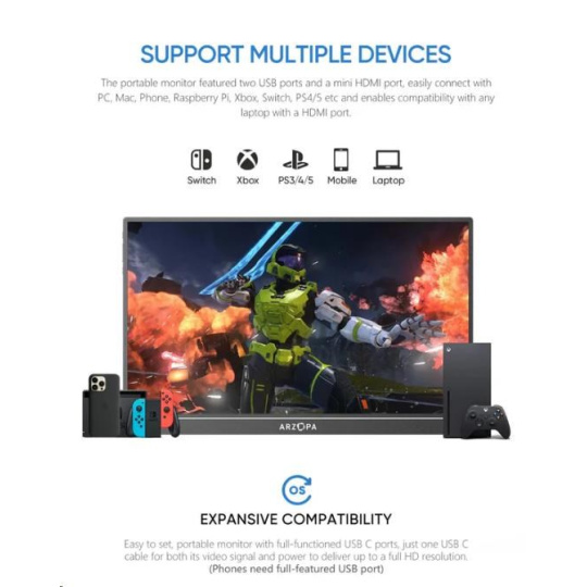 Monitor Arzopa Z1FC nabízí působivou úhlopříčku 16,1 palce podpořenou obnovovací frekvencí 144 Hz, která zaručuje plynulý obraz i v těch nejdynamičtějších scénách. Díky jasu 250 cd/m2 a širokému barevnému gamutu 100 % sRGB se obraz vyznačuje výjimečnou hloubkou a intenzitou barev. Vysoký kontrastní poměr 1200:1 a paleta 16,7 milionu barev (8 bitů) navíc zajišťují ostrý a detailní obraz.