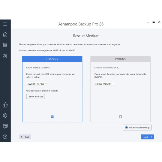 Ashampoo Backup Pro vám kryje záda, když dojde k havárii systému: Náš nejmodernější záchranný systém založený na systému Windows dokáže restartovat počítač z disku DVD nebo USB. Místo úplné přeinstalace systému Windows pak můžete jednoduše obnovit předchozí zálohu systému a vrátit počítač do normálního stavu. Ušetřete čas a námahu a udržujte svůj počítač i své soubory v bezpečí s programem Ashampoo Backup Pro!