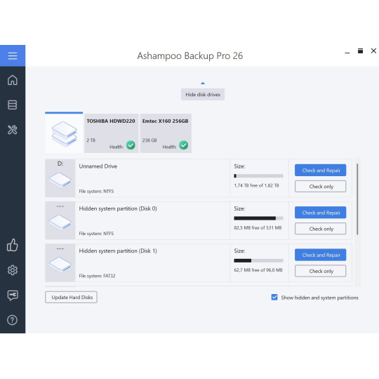 Záloha je tak bezpečná, jak bezpečný je pevný disk, na kterém je uložena! Proto Ashampoo® Backup Pro během zálohování sleduje parametry SMART vašeho pevného disku, aby odhalil budoucí problémy dříve, než nastanou! Díky tomu máte čas reagovat a zabránit ztrátě dat. Program je také vybaven dodatečnou kontrolou disku/oddílu, která analyzuje a opravuje jednotlivé sektory. Ať už se jedná o interní nebo externí disk, Ashampoo® Backup Pro se o vaše pevné disky postará mimořádně dobře!
