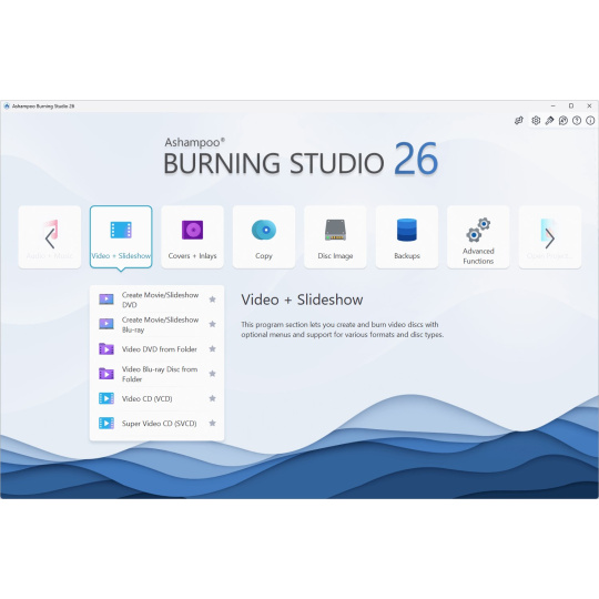 Nové Ashampoo Burning Studio 26 představuje nejpohodlnější způsob bezpečného vypalování dat a kopírování disků CD, DVD a Blu-ray bez námahy. Ripujte audio disky a zálohujte svou hudbu nebo vytvářejte vlastní hudební kompilace s vhodnými obaly! Další špičkové multimediální funkce vám také umožní vytvářet vlastní filmy a prezentace, a dokonce je umožní vypálit na disk spolu s šikovnými animovanými nabídkami. Rozlučte se se ztrátou dat, okamžitě zálohujte své soubory a vypalujte důležitá data na jakýkoli typ disku pomocí výkonné komprese a ochrany heslem. A nové komfortní funkce pro audioknihy, audioprojekce a podcasty jsou zárukou kvalitní zábavy!