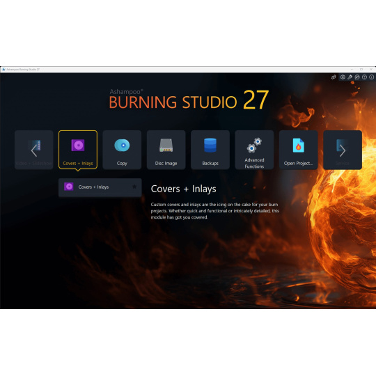 Vytváření obalů a intarzií bylo vždy silnou stránkou Burning Studia. Intuitivní úvodní nabídka vás nasměruje správným směrem a umožňuje vám ihned vybrat si oblíbené obrázky. Poté se krok za krokem dostanete k hotovému obalu. Pro úsporu času a úsilí vám funkce importu pomůže analyzovat váš disk a automaticky stáhne potřebná metadata z internetu a v případě potřeby vytvoří vhodný seznam skladeb. Ať už potřebujete rychle vytvořit obal, nebo si navrhnout vlastní od základů, nebudete zklamáni!