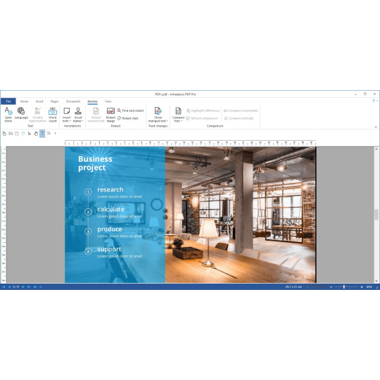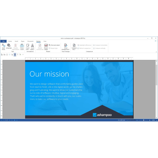 Pracujte chytřeji a šetřete kliknutí s inteligentními funkcemiAshampoo PDF Pro 5 předvídá vaše potřeby a poskytuje znatelné pohodlí při každodenním používání. Když otevřete PDF soubor z Průzkumníka Windows, zobrazí se nyní jako nová karta ve vašem stávajícím okně. Nové zobrazení Rozvržení knihy zobrazuje dvě stránky vedle sebe, stejně jako skutečná kniha, a posouvání po stránkách umožňuje přesunout se přesně o jednu stránku na jedno otočení kolečka myši. Přetáhněte dva soubory PDF do programu a spusťte okamžité porovnání dokumentů, abyste na první pohled viděli rozdíly. Při přidávání textu si Ashampoo PDF Pro 5 pamatuje naposledy použité písmo a velikost, čímž zajišťuje konzistentní vzhled bez nutnosti ručního upravování.