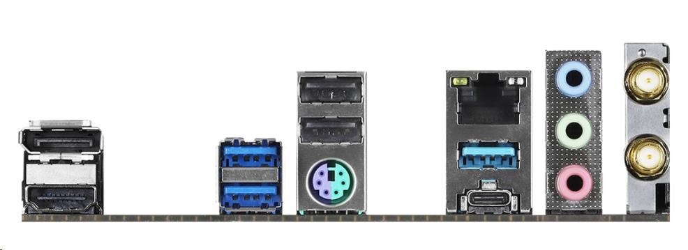 | Rear panel I/O | - 2 x Antenna Ports - 1 x PS/2 Mouse/Keyboard Port - 1 x HDMI Port - 1 x DisplayPort 1.4 - 2 x USB 2.0 Ports (Supports ESD Protection) - 3 x USB 3.2 Gen1 Type-A Ports (Supports ESD Protection) - 1 x USB 3.2 Gen1 Type-C Port (Supports ESD Protection) - 1 x RJ-45 LAN Port with LED (ACT/LINK LED and SPEED LED) - HD Audio Jacks: Line in / Front Speaker / Microphone |