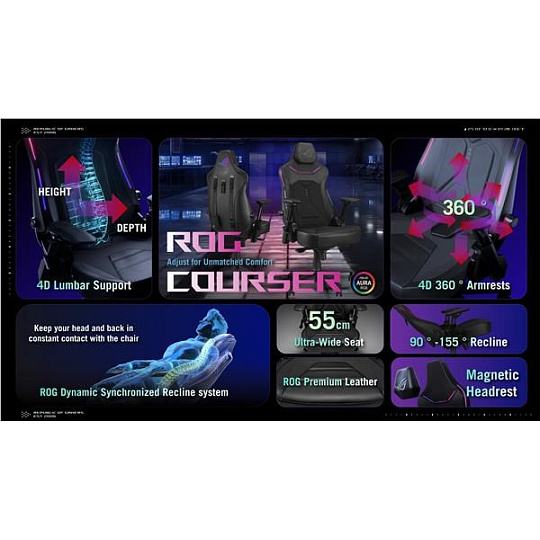 Herní židle ROG Courser s nastavitelnou bederní opěrkou lisovanou za studena pro podporu a proudění vzduchu, 4D područkami, ultraširokým sedákem, magnetickou opěrkou hlavy, dynamickým synchronizovaným systémem sklápění a osvětlením Aura RGB