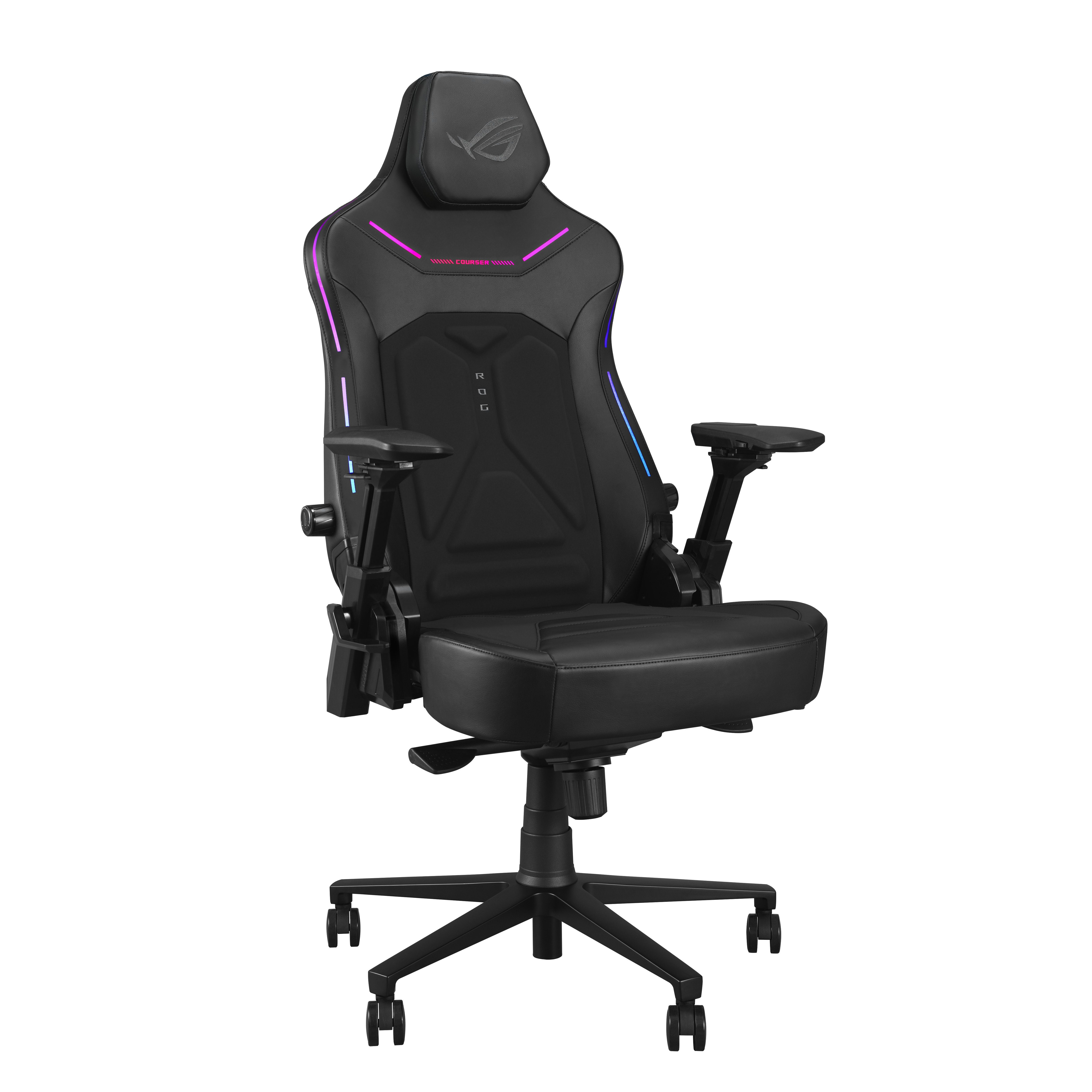 Herní židle ROG Courser s nastavitelnou bederní opěrkou lisovanou za studena pro podporu a proudění vzduchu, 4D područkami, ultraširokým sedákem, magnetickou opěrkou hlavy, dynamickým synchronizovaným systémem sklápění a osvětlením Aura RGB