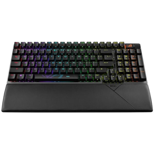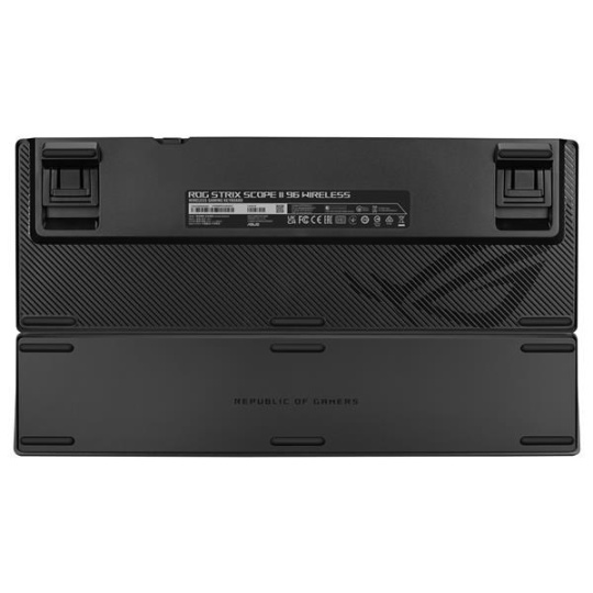Bezdrátová herní klávesnice ROG Strix Scope II 96 s připojením ve třech režimech, klávesové zkratky pro streamování, multifunkční ovládací prvky, mechanické spínače ROG NX s možností výměny za provozu, stabilizátory klávesnice ROG, krytky kláves PBT doubleshot a silikonová tlumicí pěna, tři úhly sklonu a opěrka zápěstí