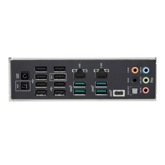 1 x USB 3.2 Gen 2x2 port(s) (1 x USB Type-C®) 4 x USB 3.2 Gen 2 port(s) (4 x Type-A) 8 x USB 2.0 port(s) (8 x Type-A) 1 x Marvell® AQtion 10Gb Ethernet port 1 x Intel® 2.5Gb Ethernet port 5 x Audio jacks 1 x Optical S/PDIF out port 1 x BIOS FlashBack™ button 1 x Clear CMOS button