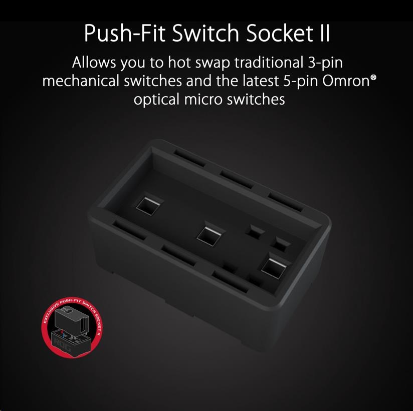 - Push-Fit Switch Socket II - The world’s first Push-Fit Switch Socket II design allows you to hot swap traditional 3-pin mechanical switches and the latest 5-pin Omron® optical micro switches.