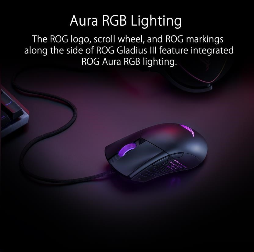 - Aura RGB Lighting - The ROG logo, scroll wheel, and ROG markings along the side of ROG Gladius III feature integrated ROG Aura RGB lighting. The laser-engraved side panel also features special flicker effects that can be customized with the color of your choice.