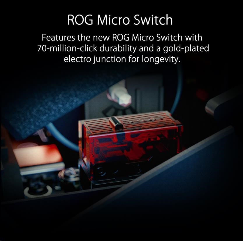 - ROG Micro Switch - The ROG Micro Switch features a gold-plated electro-junction and a 70-million-click lifespan to improve durability and extend the lifespan of the mouse. Strict ROG manufacturing standards ensure that each mouse button keeps force deviation within +/- 5 gram-force for a consistent click feel.