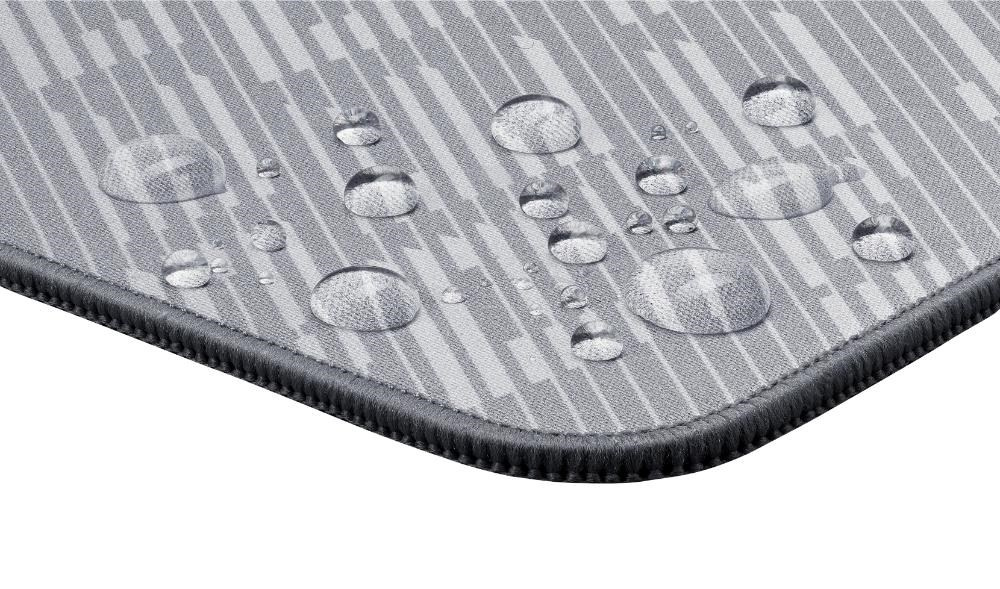 ROG Scabbard II Arctic Gray XXL je velká herní podložka pod myš s povrchem odolným proti vodě, oleji a prachu, s plochými prošitými okraji proti oděru a protiskluzovou gumou dole.