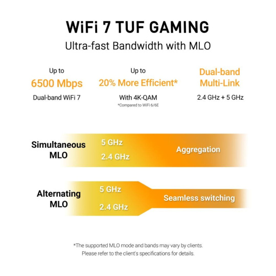 - 4K-QAM & Multi-Link Operation – WiFi 7 dvoupásmový router poskytuje rychlost až 6500 Mb/s. 4096-QAM zvyšuje rychlost 1,2X a Multi-Link Operation (MLO) zvyšuje stabilitu a efektivitu připojením více pásem současně.