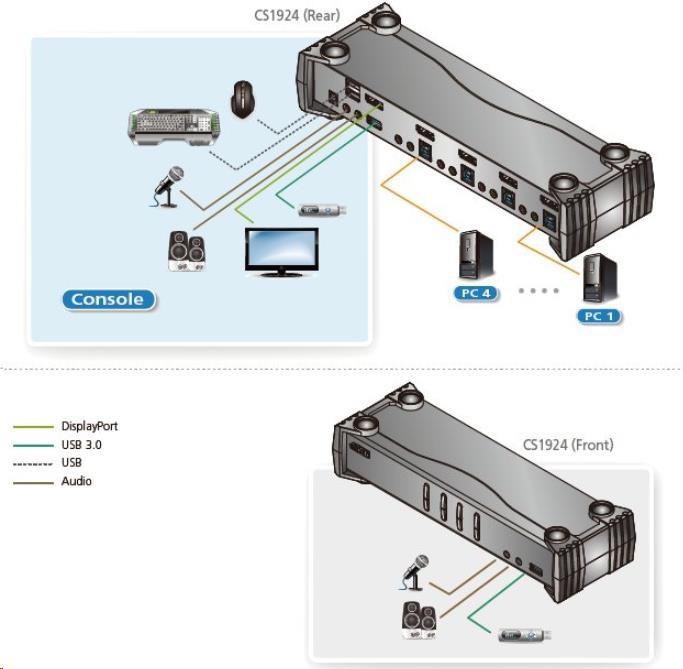 Aten CS1924 4-port 4K DisplayPort KVMP 3.0 přepínač umožní jednomu uživateli sdílet čtyři připojené počítače za pomocí jedné klávesnice, myši a monitoru.