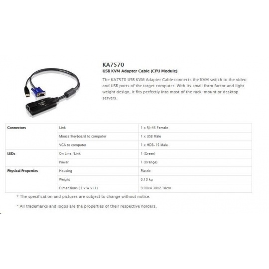 | Konektory | USB samec typ A 1x VGA samec 1x 1x RJ-45 pro připojení do KVM |