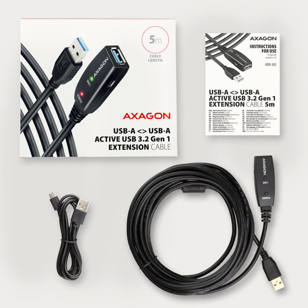 Aktivní prodlužovací USB 3.2 Gen 1 kabel AXAGON ADR-305 délky 5 metrů je ideální k propojení Vašeho počítače s USB zařízením jako je myš, klávesnice, webkamera, tiskárna, skener, plotr a dalšími. Aktivní USB repeater kabel zesiluje průchozí signál a umožnuje připojit USB zařízení na výrazně větší vzdálenost, než Vám umožní pasivní kabel. Dosah kabelu je možné dále prodloužit použitím několika kabelů za sebou.
