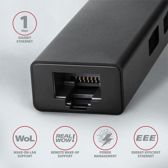 Štíhlý kovový USB 3.2 Gen 1 (USB 3.0) multi-port hub AXAGON HMA-GL3A nejen připojí k notebooku nebo počítači až tři USB zařízení současně, ale přidá také gigabitovou síťovou kartu, která připojí váš počítač k vysokorychlostní síti. Kovové tělo hubu je vyrobeno z hliníku a zajišťuje tak dokonalou mechanickou ochranu pro časté přenášení. Elegantní, jemně strukturovaný povrch brání nežádoucím otiskům. Napevno uchycený USB kabel délky 20 cm je ideální pro uživatele mobilních zařízení.