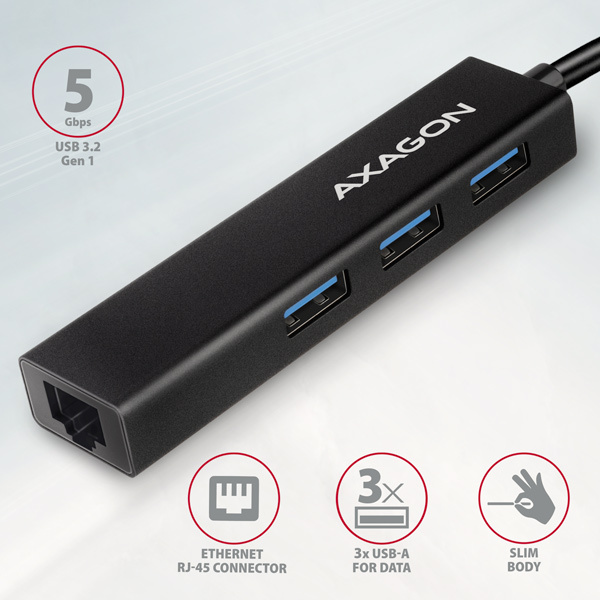 AXAGON HMC-GL3A, USB 3.2 Gen 1 hub, porty 3x USB-A + Gigabit Ethernet, kovový, kabel USB-C 20cm