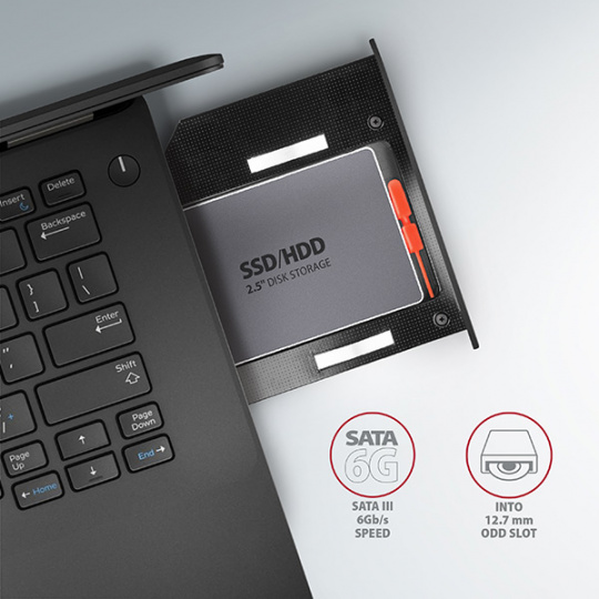 Do rámečku je možné použít standardní SSD disky výšky 7 mm i pevné disky výšky 9.5 a 12.5 mm o rozměru 2.5". ODD caddy s osazeným diskem se chová jako standardní pevný disk v operačním systému i v BIOSu (UEFI). Vložením disku do redukce snadno přidáte interní 2.5" disk, kterým lze doplnit stávající disk v notebooku. Díky podpoře bootování lze přidáním 2.5" SSD disku výrazně zrychlit starší notebook.