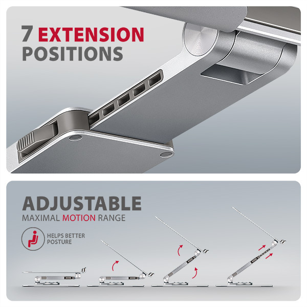 Unikátní funkcí je výsuvné rameno s pojistkou proti uvolnění, které umožňuje jeho prodloužení až o 6 cm díky sedmi nastavitelným pozicím. Tímto způsobem snadno nastavíte notebook do optimální výšky a vzdálenosti od vašich očí přesně podle vašich potřeb. Chytré řešení s dvojitým kloubem poskytuje plynulé nastavení výšky obrazovky tak, aby byla v jedné rovině s vaším externím monitorem. Tím získáte další pracovní plochu ve správné úrovni očí, což výrazně zlepšuje ergonomii, zvyšuje pohodlí a zároveň podporuje vaši produktivitu.